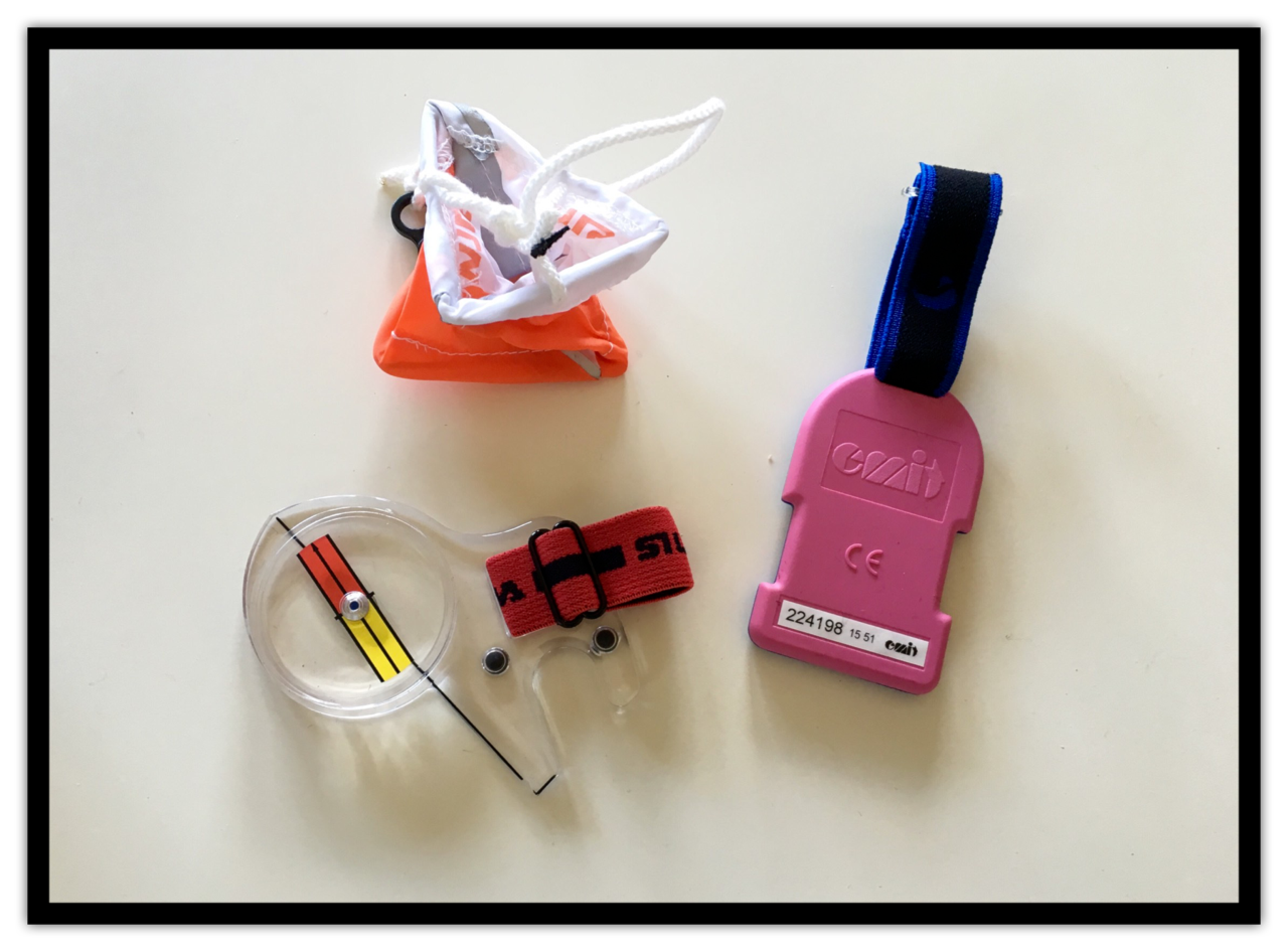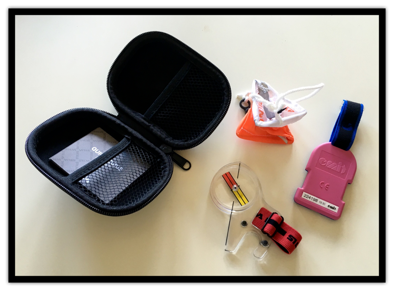 Pakken inneholder: tommelkompass, løperbrikke og en liten post-skjerm samlet i et praktisk etui.
